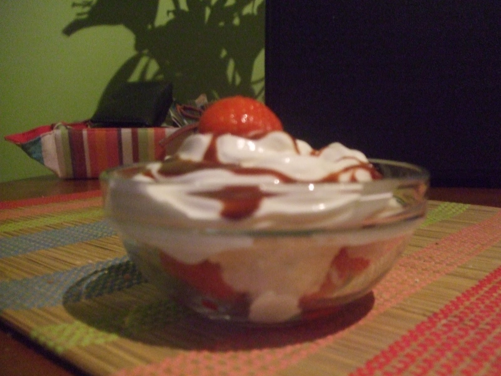 Krok 4:Na spod miseczki lub pucharka  rozlozcie pokrojone na pol truskawki (powinnnyscie miec 6 polowek)